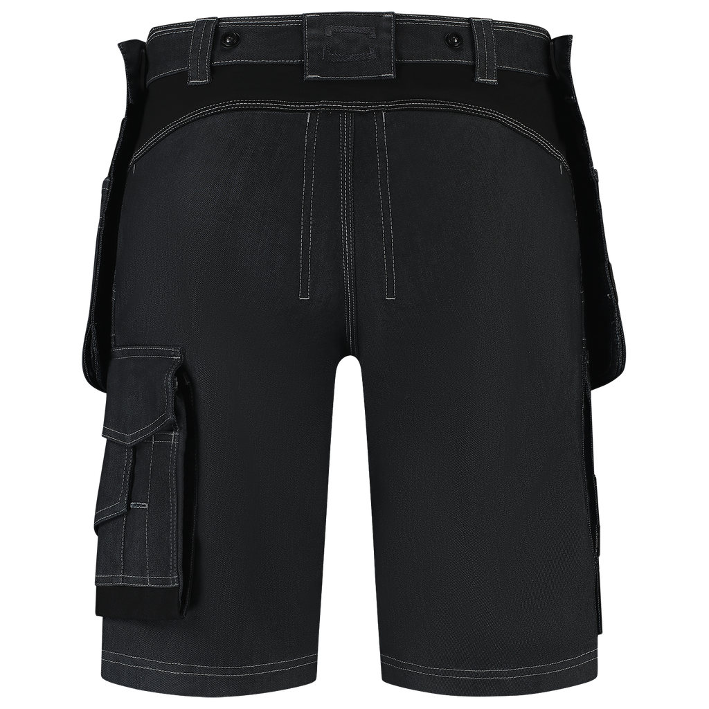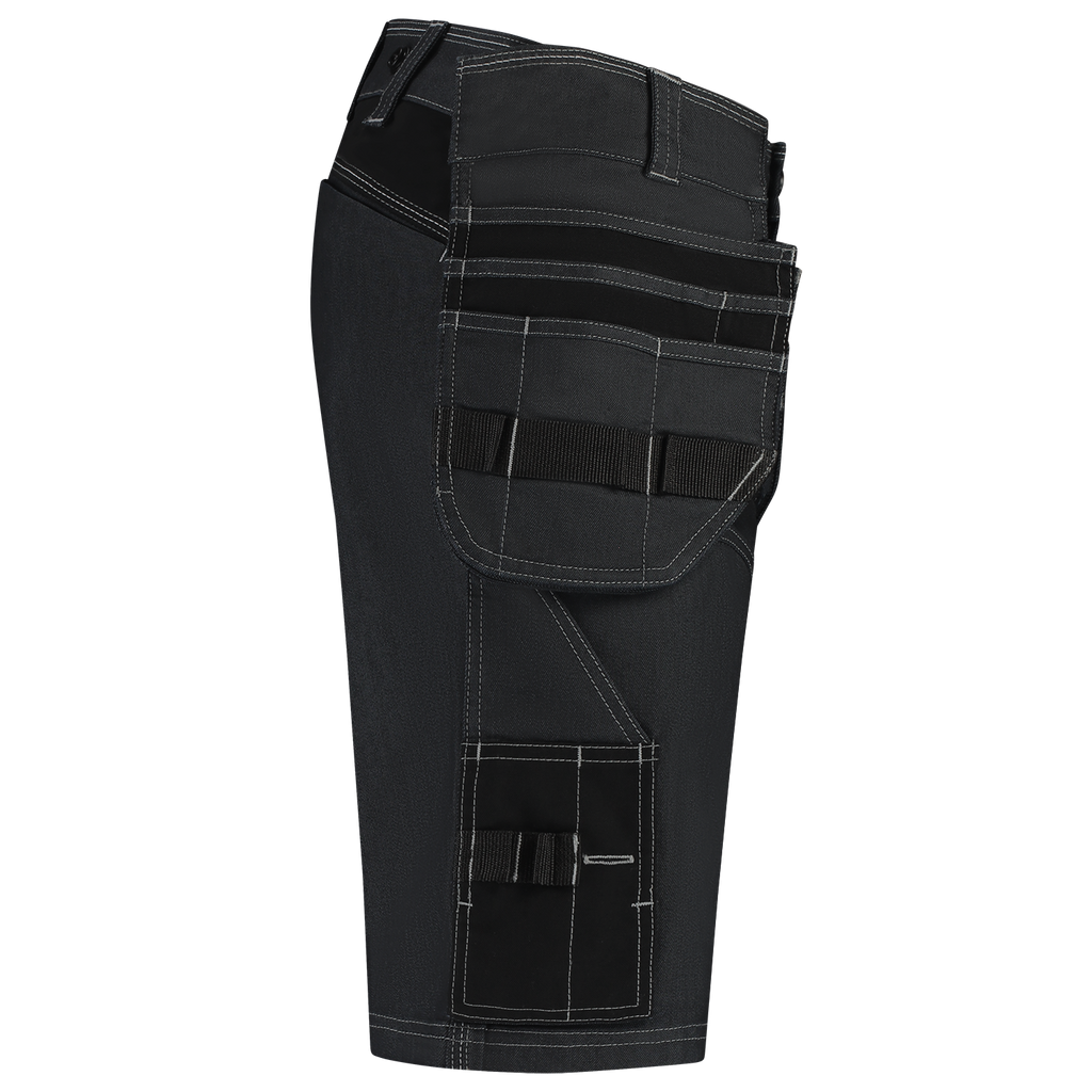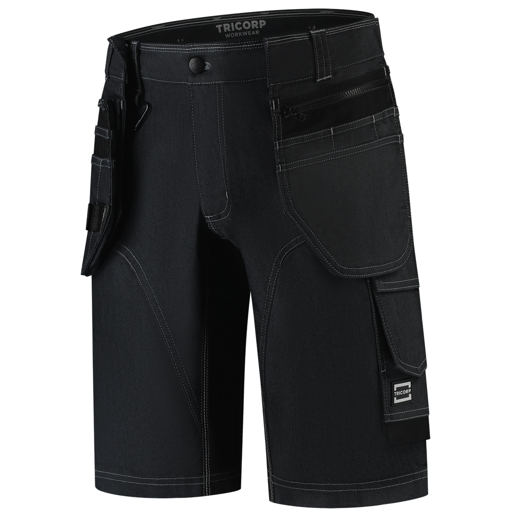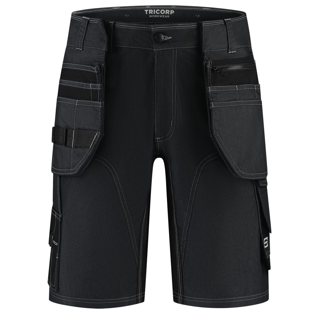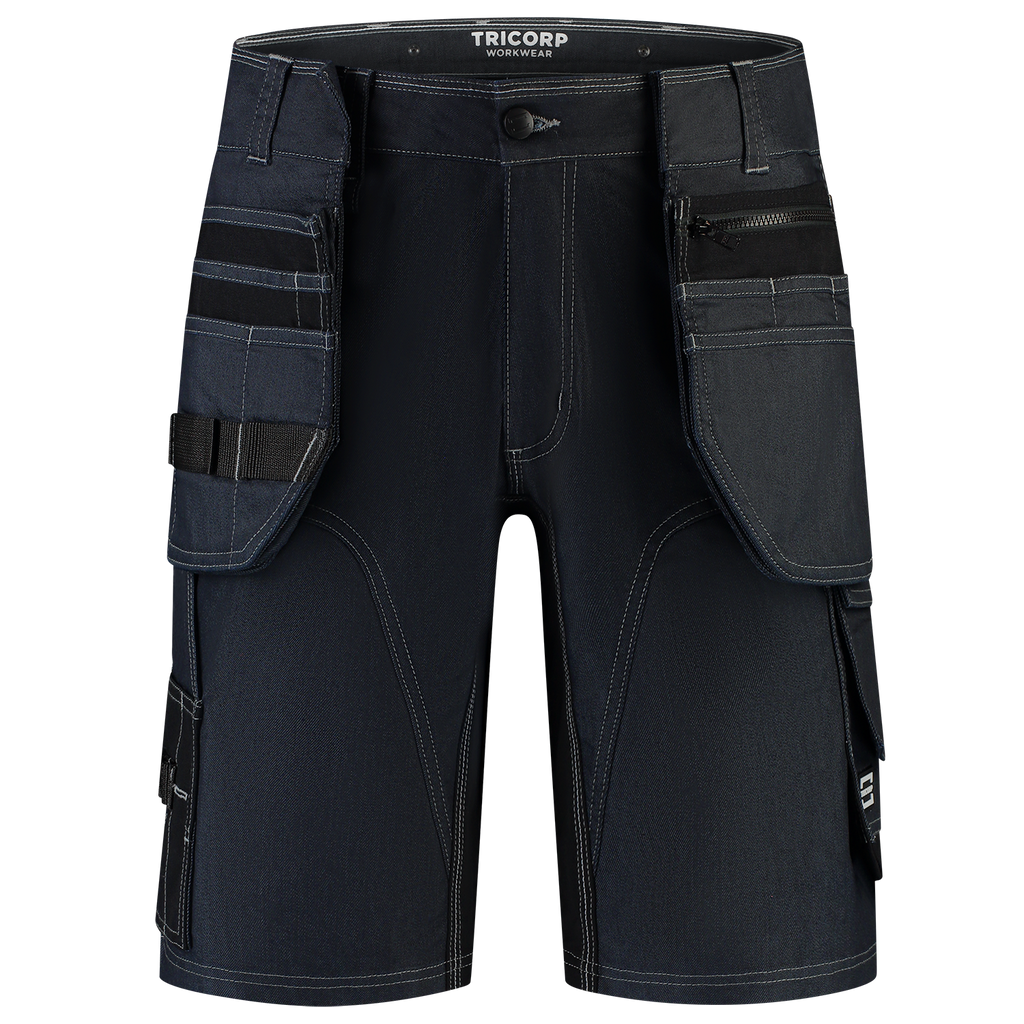 The Jeans Work Pants Functional Stretch Redefined short from Tricorp is not your average work pants: it is a next-level workwear piece made for real craftsmen. Whether you're working on the construction site or in the workshop on a daily basis, these jeans offer everything you need for comfort, durability and functionality. These work trousers are made up of a strong 2-way stretch twill mix of 55% BCI cotton, 30% polyester and 15% polyamide, with a fabric weight of 335 g/m². Thanks to strategically placed 4-way stretch panels of 90% polyamide and 10% elastane in the crotch, these work pants move smoothly with you. The raised back panel is also supported with 4-way stretch panels, so the pants always fit perfectly. The wear-resistant Cordura® reinforcements on vulnerable parts ensure that these pants can withstand intensive use. Thanks to smart details such as a ruler pocket, smartphone pocket with flap and thigh pocket with volume pleat, these work trousers are made for action. The improved fit and sturdy zipper ensure that you are always ready for your job. The pants are equipped with six buttons to hang tool pockets, a detachable D-ring and practical belt loops. The Jeans Work Pants Functional Stretch Redefined Short is available in Black and Ink and in sizes 42 - 66. The work trousers comply with the OEKO-TEX® Standard 100, which means they are free of harmful substances. Combine these pants with other items from the Redefined line for a complete, professional and durable work outfit.