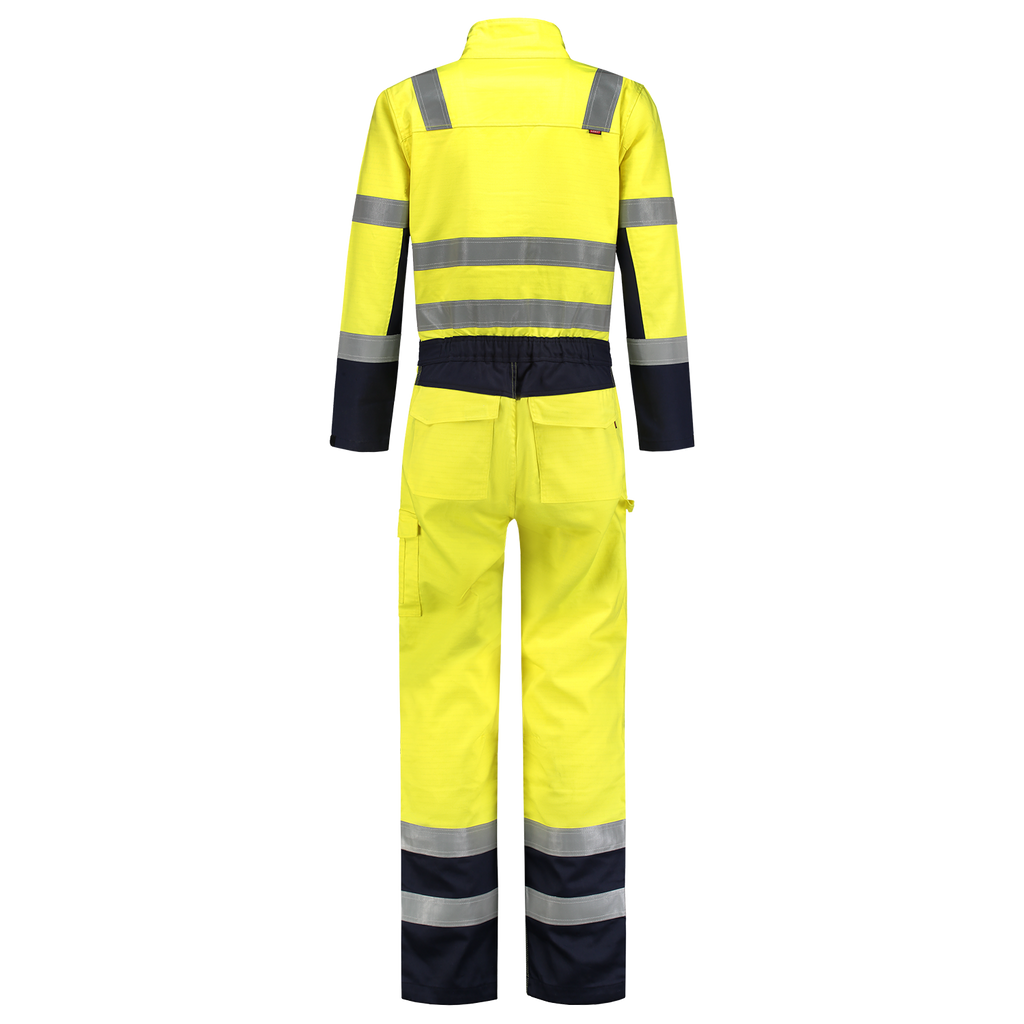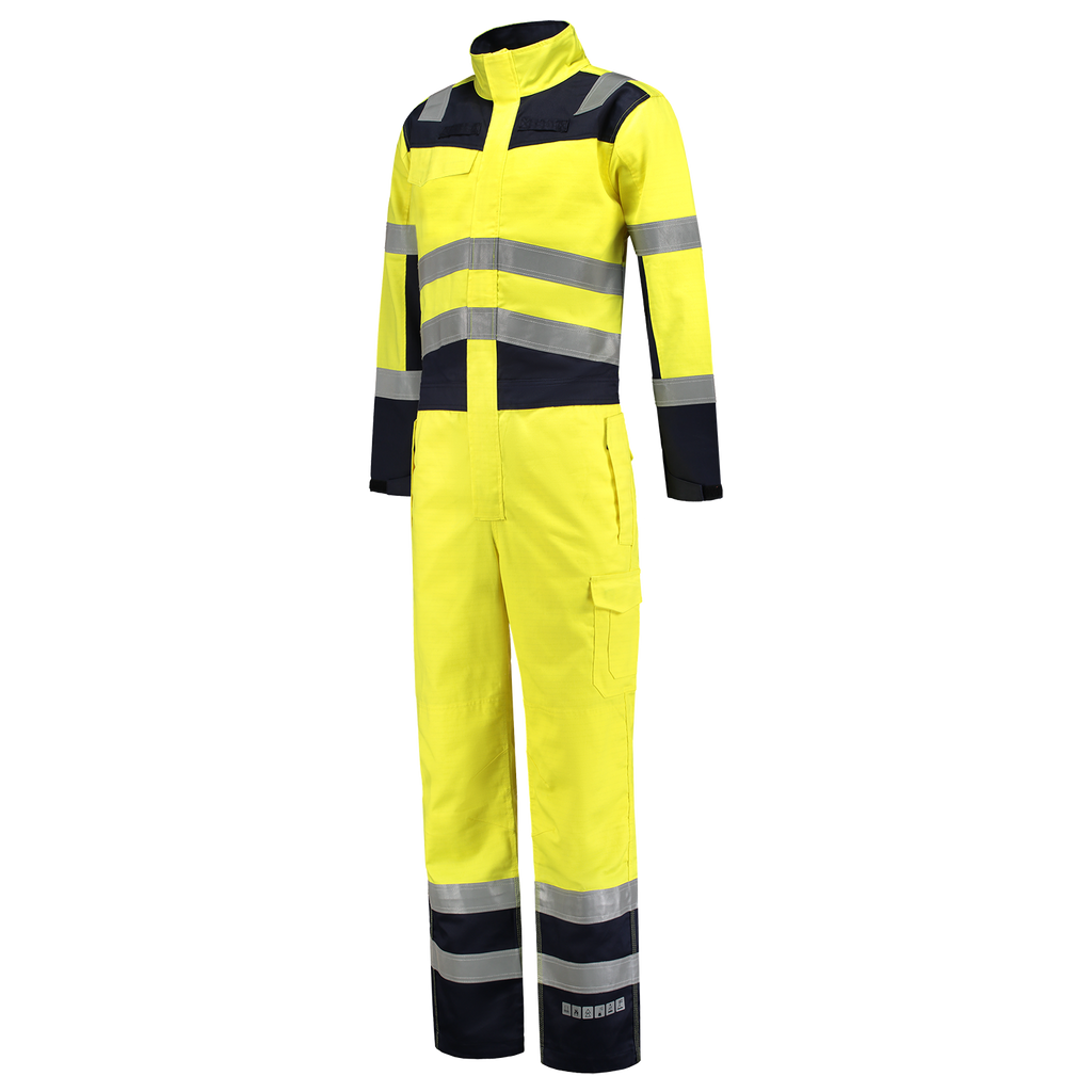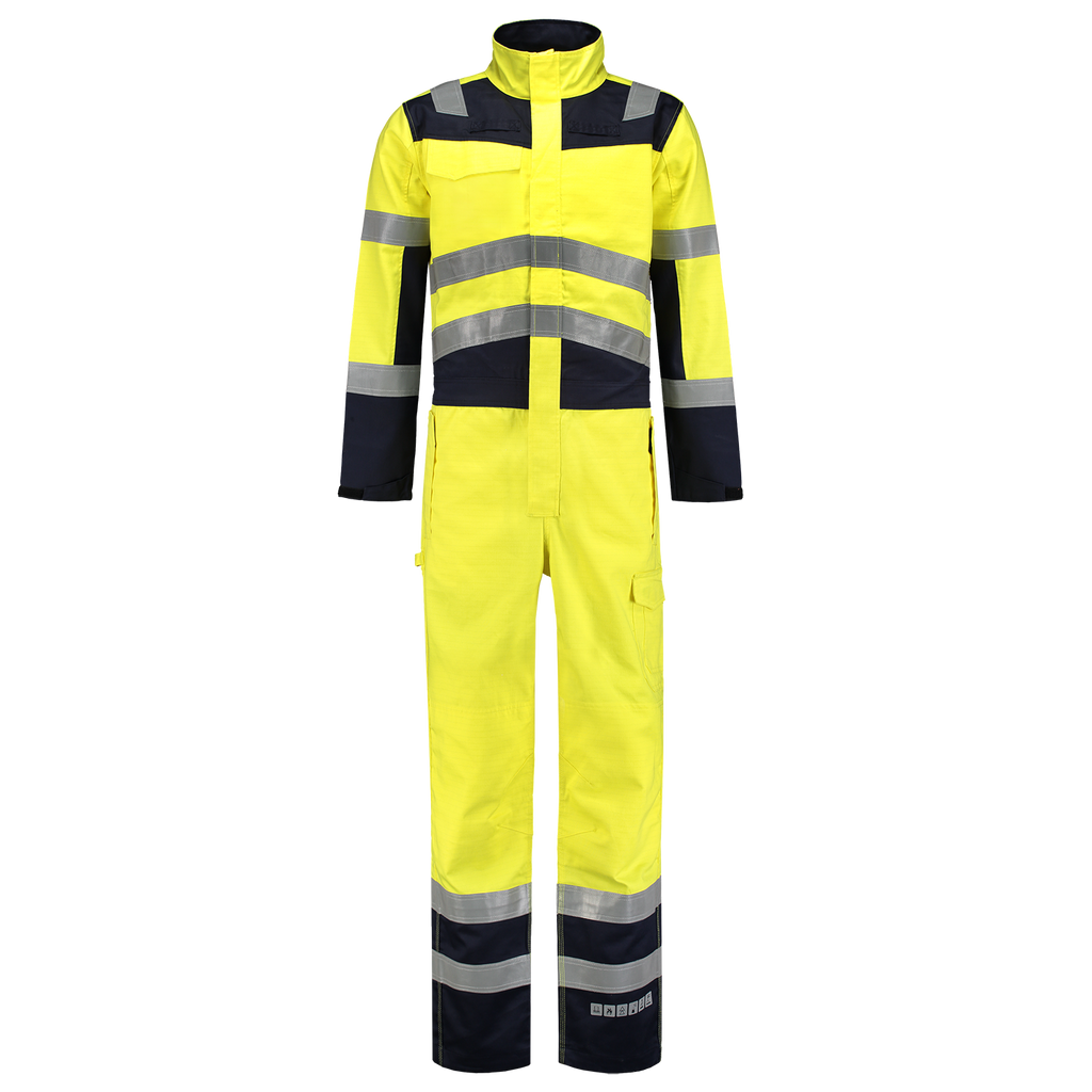 The Overall Multinorm Bicolor is made of 74% cotton, 25% Polyester and 1% other fibers with a fabric weight of 320 g/m2. This coverall is flame retardant, antistatic, protects against liquid chemicals, protects during welding and related work and protects against thermal hazards of an electric arc. In addition, this product has high visibility during the day, dusk and night thanks to the EN ISO 20471 standard.
