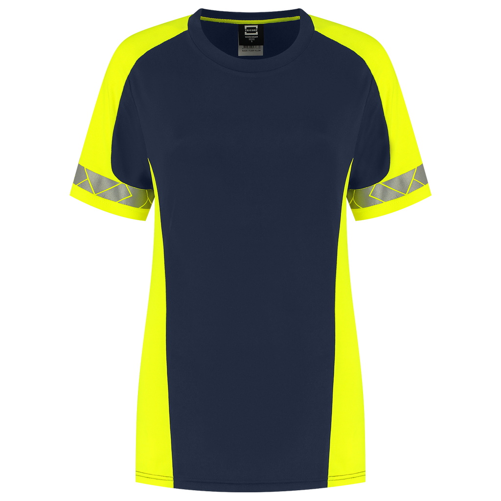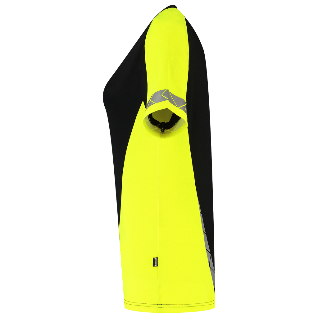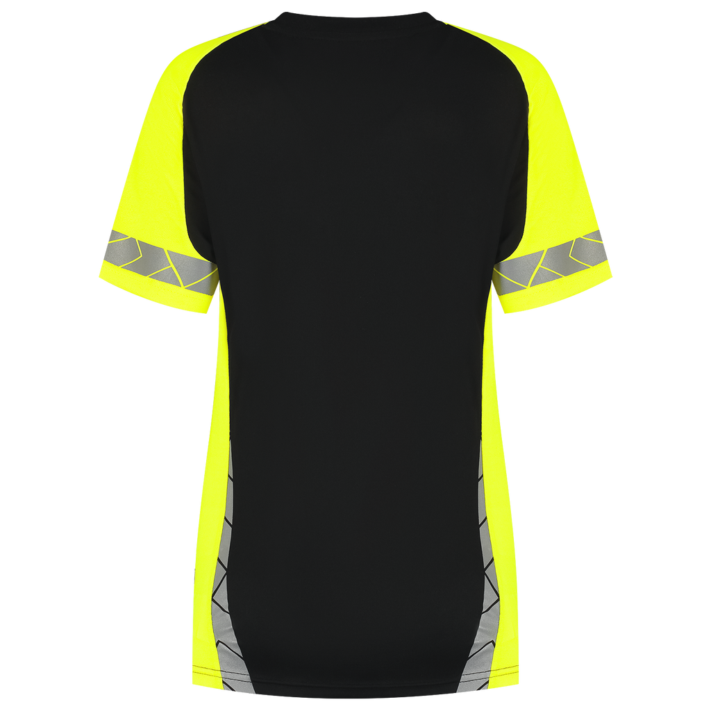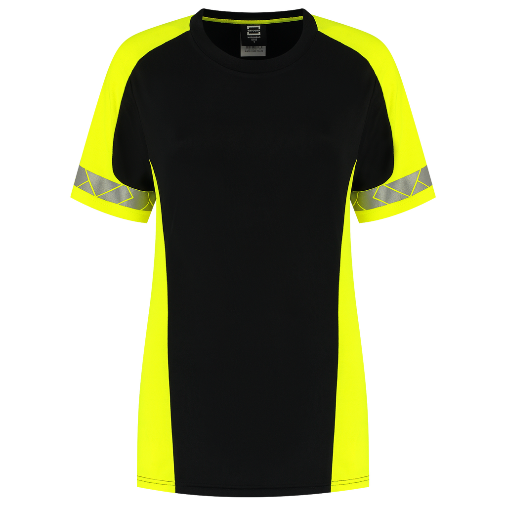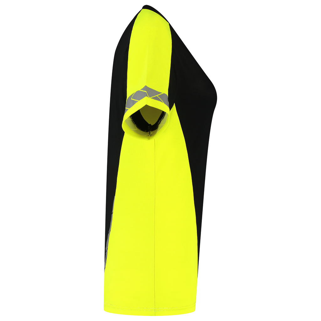 The Reflective Redefined Women's T-shirt from Tricorp combines durability, comfort and visibility, specially designed for female professionals who want to work safely day and night. This women's T-shirt is made of a high-quality blend of 55% organic cotton and 45% recycled polyester, with a fabric weight of 180 g/m². The organic cotton layer on the inside makes the T-shirt feel soft and comfortable, with excellent moisture absorption, while the polyester exterior provides durability and a sleek finish. Thanks to the segmented reflection around the sleeves and reflective elements on the back, this work shirt complies with EN ISO 17353 Medium Risk for day and night visibility. The breathable piqué structure ensures good air circulation, which contributes to a comfortable wearing feeling even during intensive work. The T-shirt has a regular fit, a classic crew neck and short sleeves, making it easy to combine with other safety clothing. The product is certified with the GRS (Global Recycled Standard) quality mark and carries the OEKO-TEX 100 label, which guarantees environmentally friendly and safe materials. The T-shirt is available in sizes XS to 5XL and in the colors Black-Fluor Yellow and Ink-Fluor Yellow. In addition, the T-shirt is washable at 60 degrees and retains its visibility and functional properties for at least 50 washes. Thanks to the built-in Polygiene StayFresh® technology, the T-shirt stays fresh and odor-free during long working days. The work shirt also offers reliable protection against harmful UV radiation thanks to the UPF 40+ classification according to the EN 13758 standard for UV protective clothing. Combine this T-shirt with other items from the Reflective Redefined line for a complete, professional and sustainable work outfit.