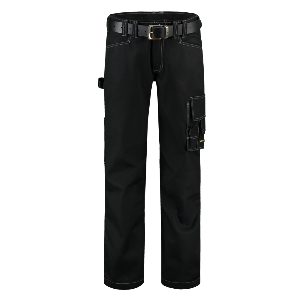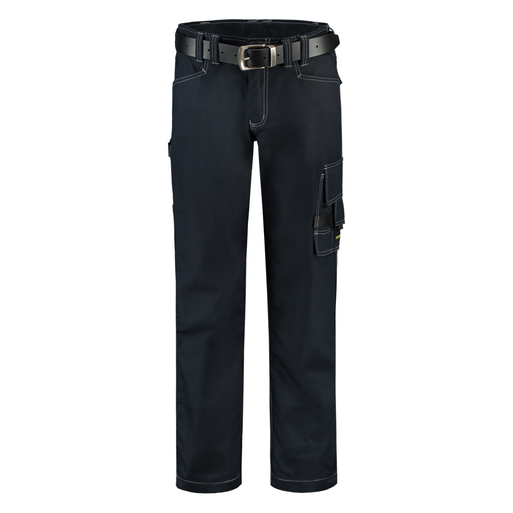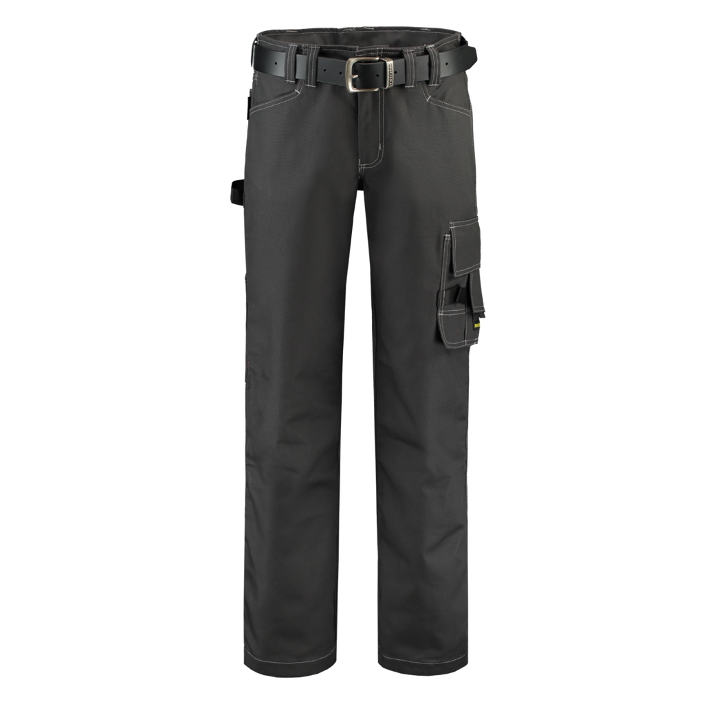 These canvas work pants have triple stitched seams, a hammer loop, a thigh pocket which can be closed, and a ruler pocket. The double hem provides about 6 cm in length.