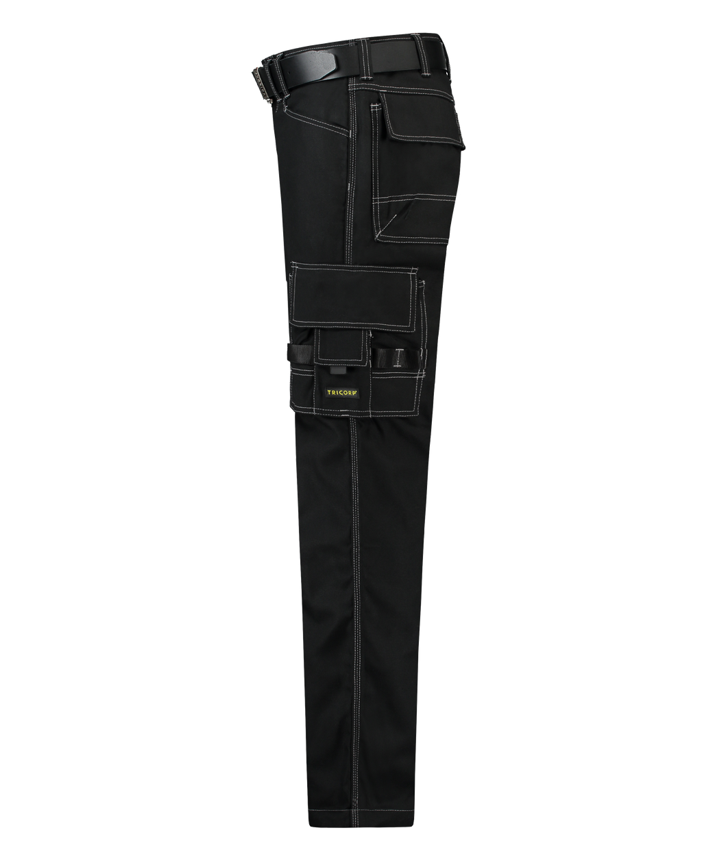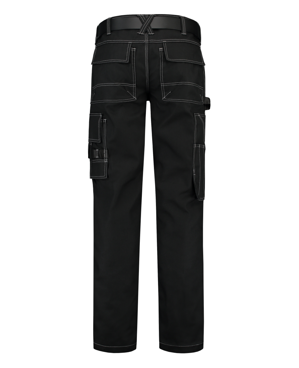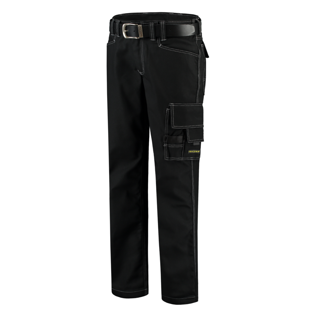 These canvas work pants have triple stitched seams, a hammer loop, a thigh pocket which can be closed, and a ruler pocket. The double hem provides about 6 cm in length.