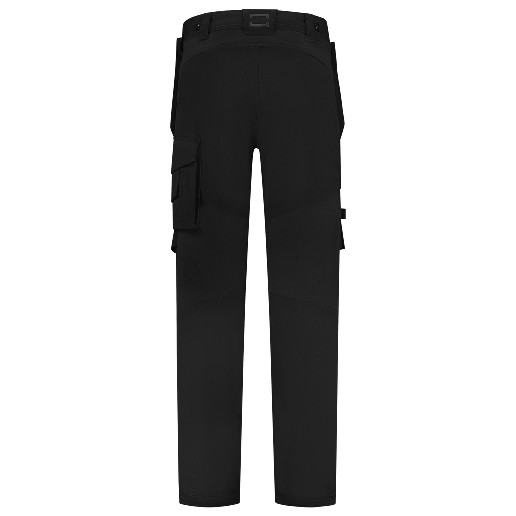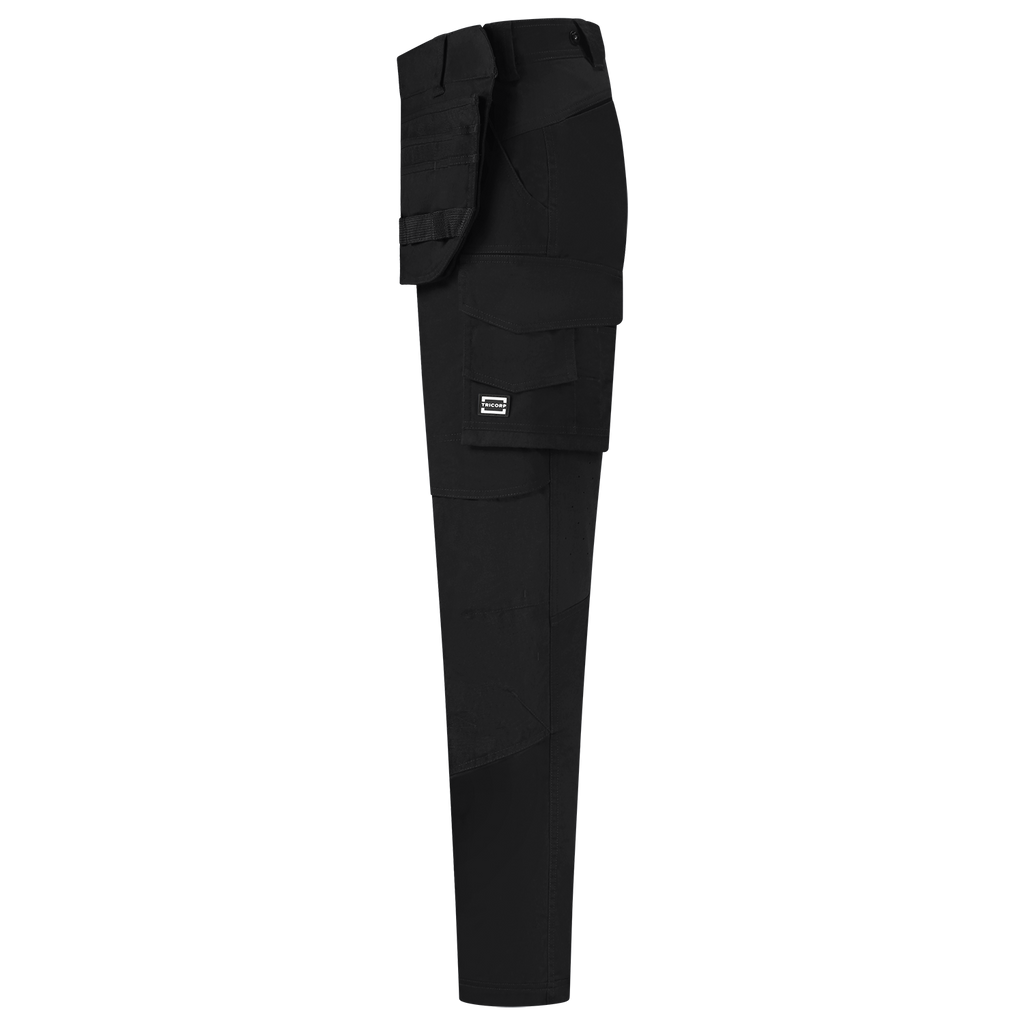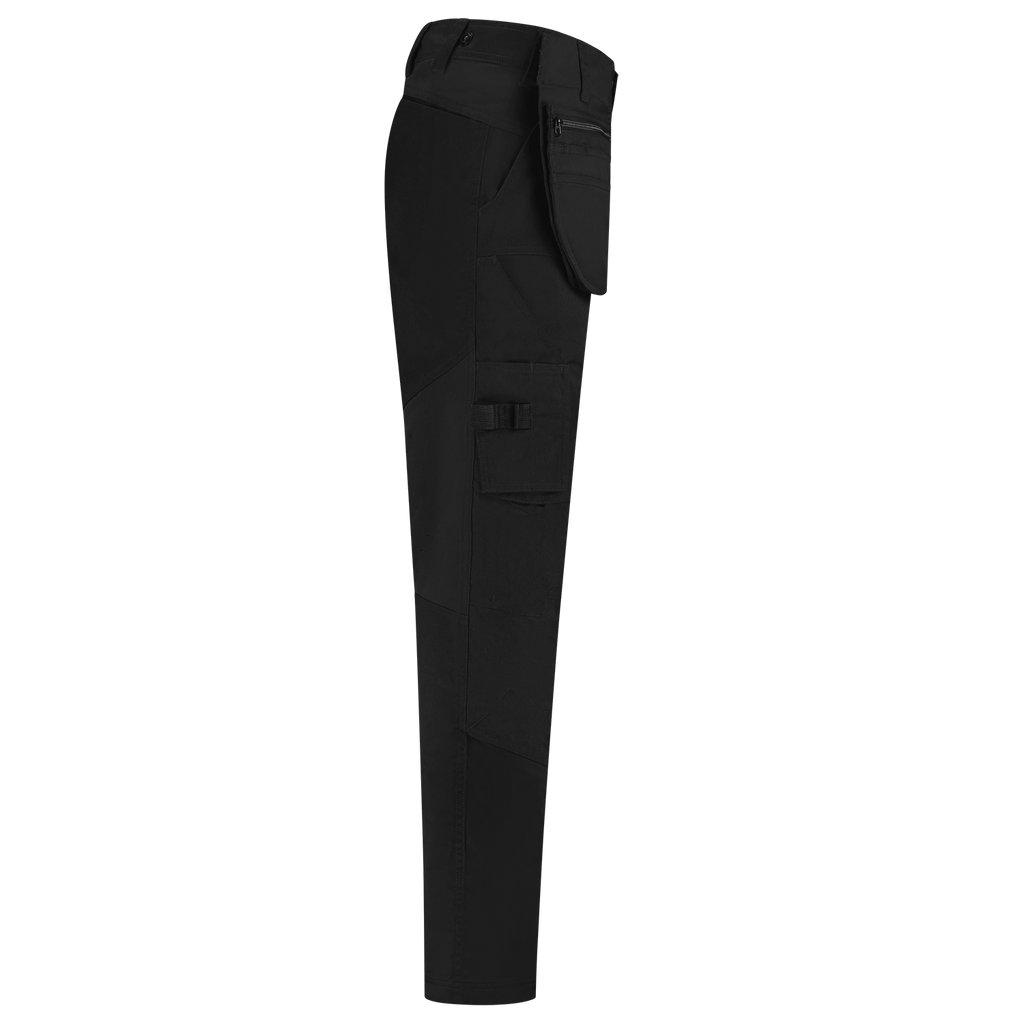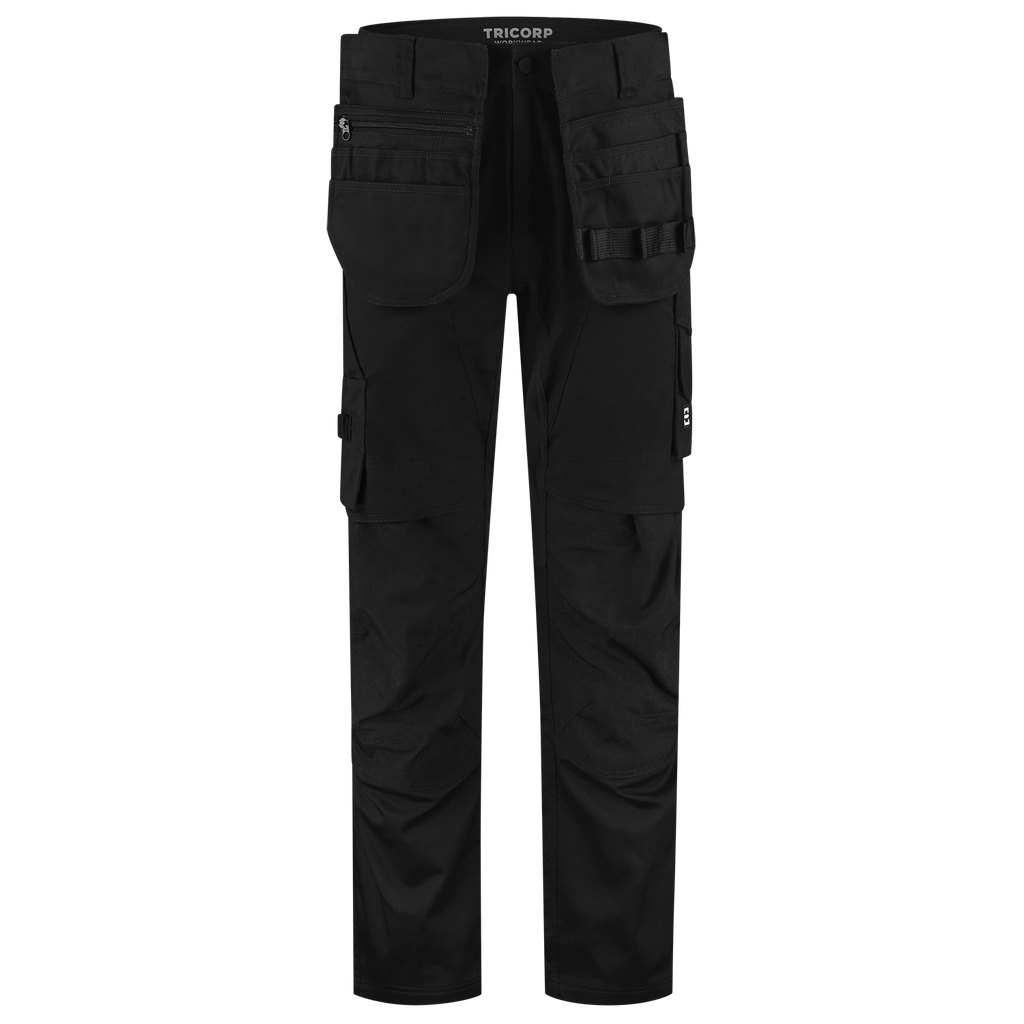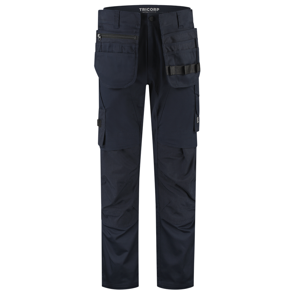 The Functional Stretch Redefined Tool Pockets Work Pants from Tricorp is for professionals who demand maximum freedom of movement and wear resistance. Made from a sturdy yet flexible material blend of 58% recycled polyester, 40% organic cotton and 2% elastane, with a fabric weight of 250 g/m2, these pants not only offer a sustainable choice, but also maximum freedom of movement. Thanks to strategically placed 4-way stretch panels of 90% polyamide and 10% elastane in the crotch and back of the knees, these work pants move smoothly with you. The raised back panel is also supported with 4-way stretch panels, so the pants always fit perfectly. The combination of 2-way stretch twill and ventilating zones in the back of the knees ensures optimal comfort during physically demanding work. Thanks to smart details such as a ruler pocket, smartphone pocket with flap, detachable D-ring, belt loops, thigh pocket with volume pleat and Cordura® reinforcements in wear-prone areas, these work trousers are made for action. The improved fit, choice of three lengths and sturdy zipper ensure that you are always ready for your job. The wear-resistant Cordura® knee pockets, which are also adjustable in height, are also ideal for anyone who regularly works on their knees. In addition, the detachable and adjustable tool pockets with smart pocket layout are perfect for storing tools, screws or your smartphone. One of the tool pockets can even be closed with a zipper, so your valuables stay safely stored. The tool pockets can be attached to both the front and the side of the pants, depending on your preference and work. The Work Pants Functional Stretch Redefined Tool Pockets are certified according to GRS, OCS and OEKO-TEX® Standard 100 and therefore offer both wearing comfort and responsible product properties. The model is available in sizes 42-66 and available in the colors Black and Ink. The pants can be combined with other items from the Redefined line for a complete, professional and durable work outfit.